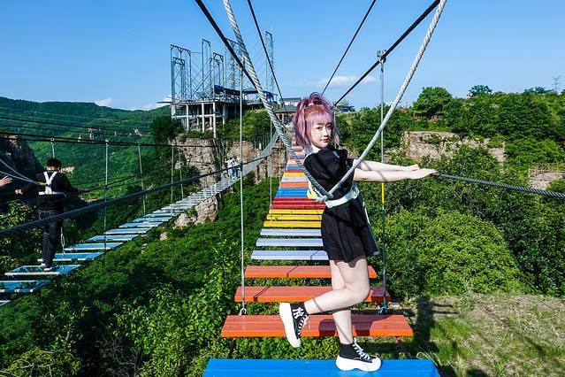空中漫步 分为玻璃漫步和木板漫步,每条长度180米。在上桥之前,会有工作人员帮忙系上安全带,承重能力极佳的安全带能够在刺激之余确保放心。