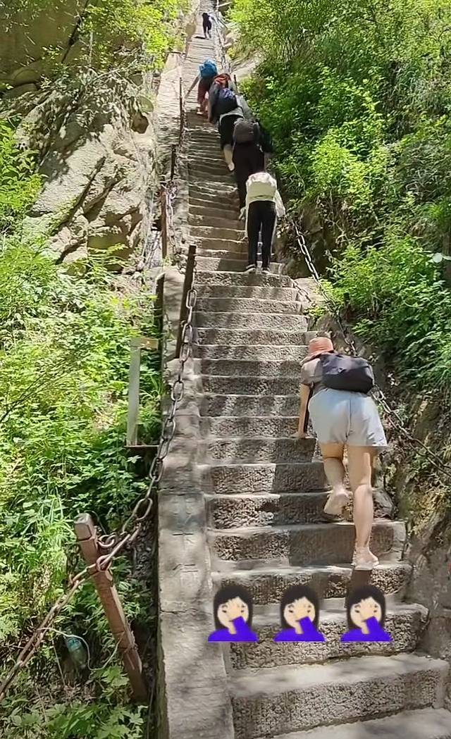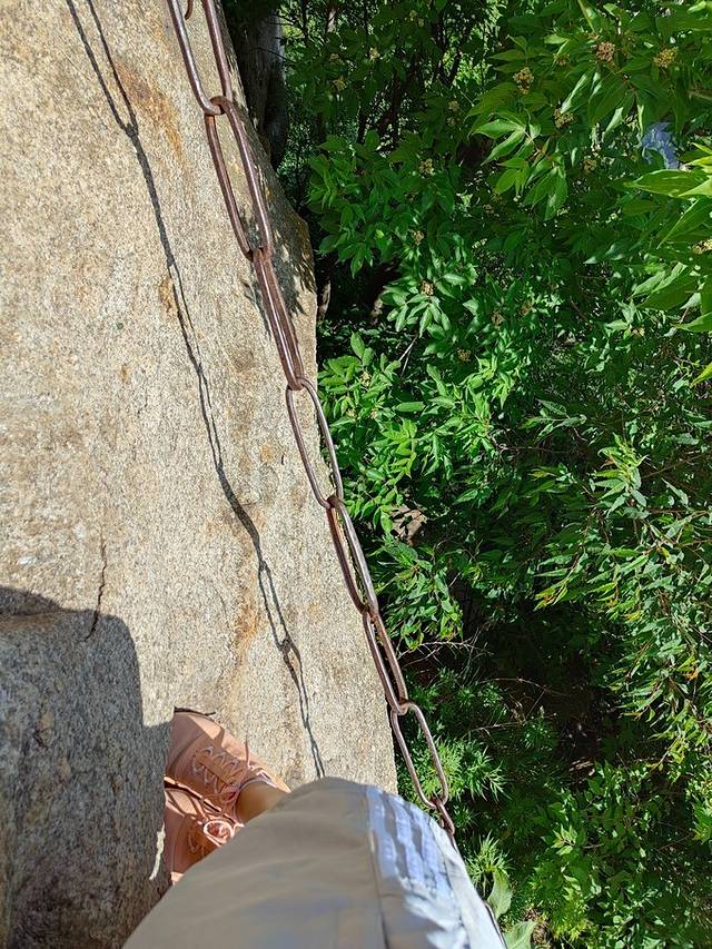 到达路线图中标黄2处的云梯,也是一段比较陡的路段,距离不长,但此处台阶特别的窄,且道路几乎垂直,需要使劲拉住铁链,注意安全哟!