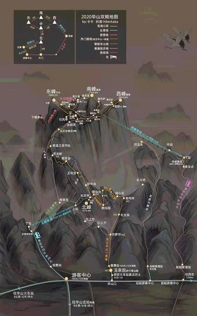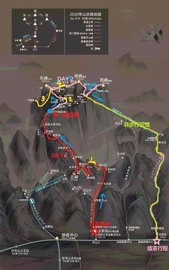 线路图中标黄的部分为个人感觉比较刺激的环节,1、2两处就是比较陡的台阶,3、4则是声名远扬的鹞子翻身和长空栈道,刺激指数更高,但也有更完备的保护措施。这4处都不是必经路线,害怕的可以不去。