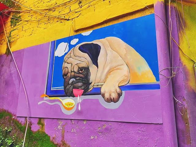 其实这条巷子最近才火的原因是因为之前的外观并没有现在的彩绘,原本只是一条很普通的无人问津的小巷子,而最近外墙进行了整修以及涂鸦,算上分支小路大概几百米左右的巷子上所有的墙体都喷上了彩绘,每栋楼体都有自己的主题,连在一起仿佛踏入了五彩缤纷的童话镇,猫猫狗狗们都有自己的神态,惟妙惟肖的,十分可爱。在马房湾玩完就中午了,吃了一下当地特色江湖菜。