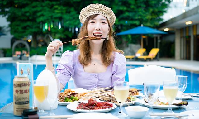 最后,坐在泳池旁的亭子下,我们体验了一把竹筒饭的制作,今天“收割”了好几个第一次。守着莫干山这片出产竹子的圣地,除了竹笋可食用,竹子也成为制作美食的工具,物尽其用。将调味好的糯米饭塞进清洗消毒后的竹筒中,之后隔着锡纸放在炭火上烘烤至熟,糯米饭被赋予了竹子的清香。