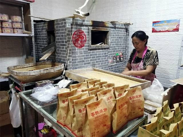 周村出产的烧饼是远近闻名的特产。烧饼铺子的大姐一人制作,动作娴熟,摊饼,粘芝麻,投炉,包装,流水作业却独自完成。这样的烧饼铺子有很多,现场制作新出炉的烧饼真的好香。比起在高速服务区超市买的周村烧饼好吃百倍。