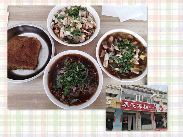 没敢进木塔景区边的小吃店,多步行了二条街,进了一家老店,看到有当地人进入,才放心的跟随。应县特色小吃:可以喝的凉粉,面皮,拉皮,红糖饼,还有一个鸡蛋夹馍。炎热的夏天,喝上这个凉粉,能感受到丝丝的清凉,味道还不错,价格真是便宜,好似是五块钱一碗。红糖饼就像是我们平常吃的油酥火烧,香而不腻。