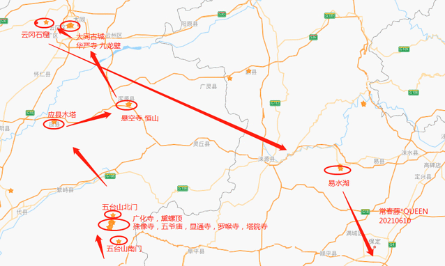 第二天:游玩罗睺寺、塔院寺-应县木榙-悬空寺-大同。245公里-5.5小时。收费71元。宿:大同