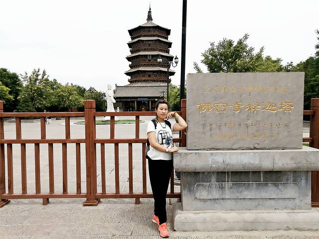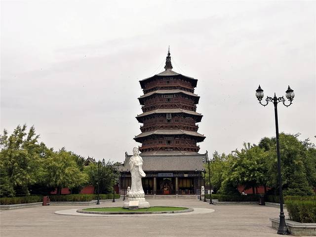 作为世界上最高、最古老的木结构佛塔,此塔建于辽代清宁二年(公元1056年),至今已历940多年,虽历经了狂风暴雨、强烈地震、炮弹轰击(塔身上弹痕累累,可以看见嵌进去的弹头),仍然屹立。它全靠斗拱、柱梁镶嵌穿插吻合,不用钉不用铆,以50多种斗拱的垫托接联砌建而成。如塔底层回廊外檐由24根木柱支撑,在静止时下层每根柱负荷120吨,可是柱下石础根本没有巢臼,木柱断面直接平立于石础之上。据说有好奇者,曾经用两手执一根细绳,把它从石础和木柱间横过。所以,民间就有24根木柱轮流间歇的传说。全塔装有木质楼梯,可逐级攀登至各层,每登上一层楼,都有不同的景观。最特别的是,这座塔内供奉的佛像非常大,造像技艺很高。第一层的释迦牟尼佛像,高达11公尺,在塔内仰望,更觉雄伟无比。周围是金刚、天王、弟子、供养人的壁画,笔法细腻传神,为辽代特有的绘画风格。 第二层由于八面来光,豁然开朗,一主佛、两位菩萨和两位协从排列,姿态生动。第三、四、五层也都供有佛像的菩萨像,层层的造像不同,构筑各异。