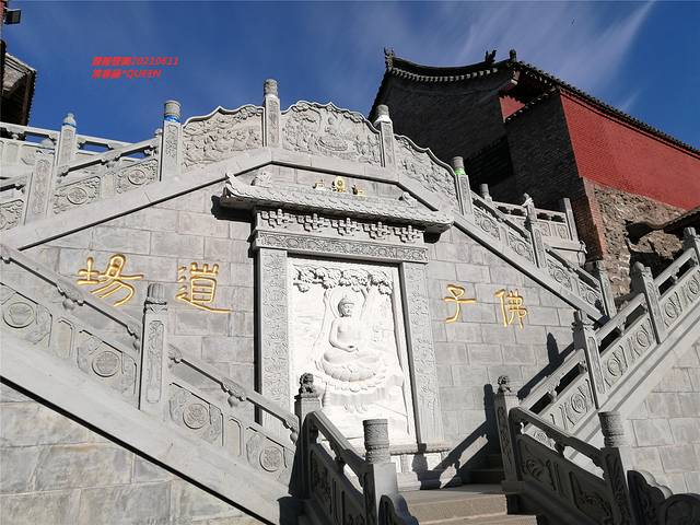 【黛螺顶】是一座寺庙,位于台怀镇中心寺庙群区以东,位于陡峭的半山脊黛螺顶上,供奉文殊菩萨的地方,前往黛螺顶可以步行,也可以坐索道。一般游客会选择一条叫“大智路”的台阶路,一共有1080级台阶,全长约500米,信众们相信,这是条通往智慧的道路,走过这条道路的人都能聪明,能增长智慧。在从山下仰望,只见巍巍高山的半山腰间又耸起一座小山。山顶寺宇的山门和牌楼围在树木之中,常有云雾缭绕。小山形如大螺,盛夏草木萋萋,呈一片黛青,故山顶寺宇名为大螺顶,又称黛螺顶。 古寺名叫佛顶庵。