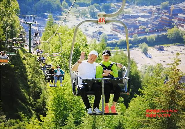 上下缆车有专门的管理人员,指引,扶行,让游客感受很安全。缆车行驶缓慢,坐在缆车上,欣赏着五台山的美景,两边高大笔直的绿树,在你的身下感到好渺小。上行出口处有专门的摄影人员,会招呼你配合拍照,出口处一排工作人员等待你取照片,因为喜欢这张照片,选做了一个水晶摆台,工作人员同意我从电脑上拍了这张照片,你懂得,呵呵。。。