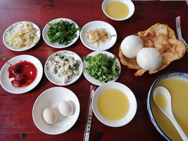 早餐七点开始,酒店上下忙碌一团。住宿的客人很多,用餐时间都是奔着易水湖游玩的,第一班游船为7:30。自助早餐每人10元。除了山鸡蛋限量其它随意添加。六碟小咸菜,都是自家菜园里种的纯绿色蔬菜。自炸的油饼,熬制的粥浓厚,配上可口的小菜,美味营养的早餐。