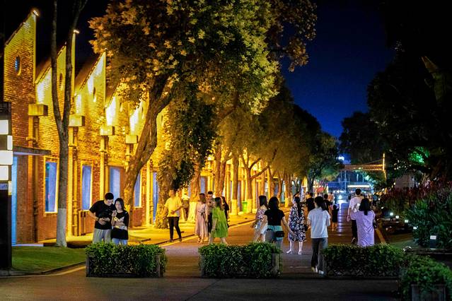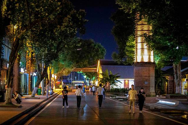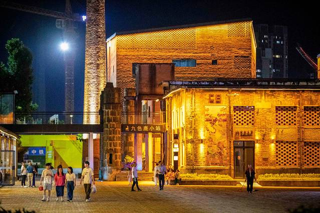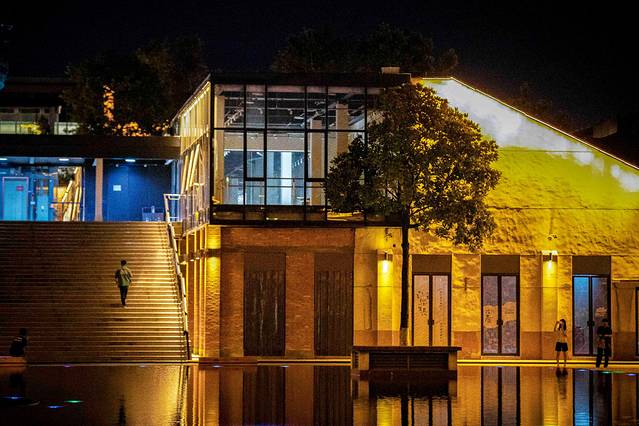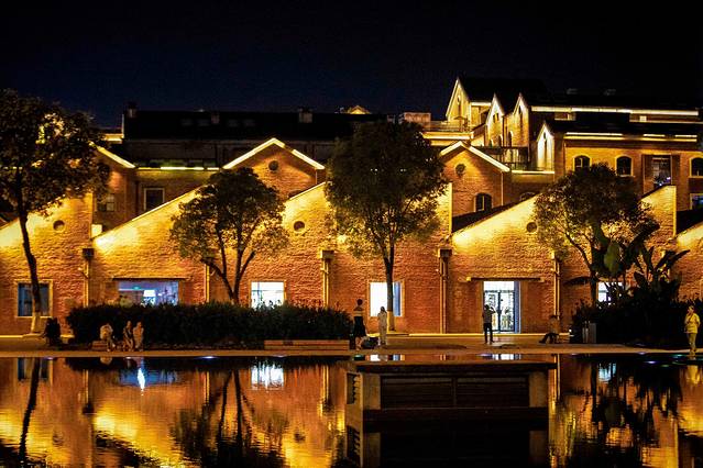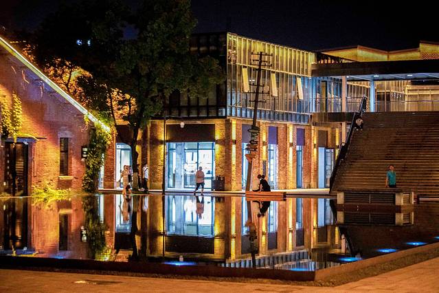 夜晚的陶溪川灯火通明,在这里你能感受到曾经陶瓷工厂的辉煌和百年的兴衰,想象着这里曾经机器轰鸣,工人们忙碌的一片热闹辉煌的景象,长长的烟囱不再浓烟滚滚,晚风拂面,美术馆的灯光在水波中荡漾,如今这里是喜爱陶瓷年轻人的聚集地。