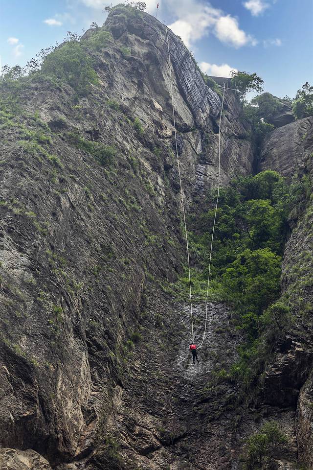 近年来,因为“飞拉达”的出现,仙人坦村成了极限爱好者心中的“必去打卡点”,海拔近400米的沓屏峰分为两座一大一小的顶冠状岩峰,高耸入云,当地人称为“百丈岩”。