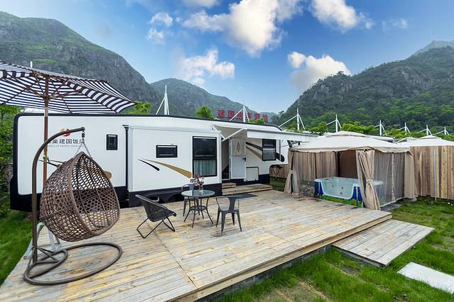 房车露营地把奢华的住宿空间和原始自然的雁荡山环境融为一体,有独立地隐蔽在丛林中的庭院,庭院内配置露天帐篷、沙滩烧烤、冲浪浴缸、摇篮等。