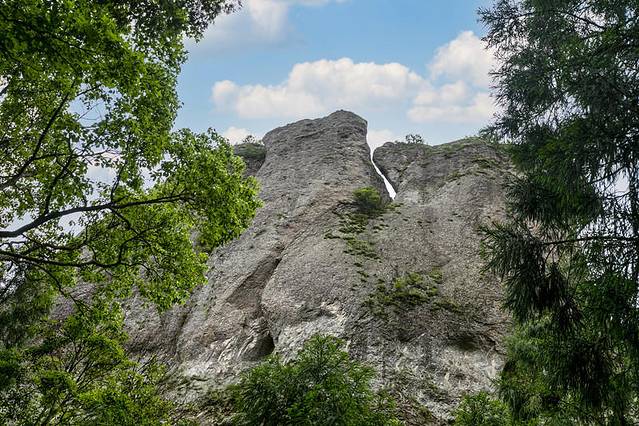大龙湫景区集峰、嶂、瀑、溪之大成。堪称雁荡山一绝。 大龙湫景区沿锦溪缓行,先看剪刀峰,它位于大龙湫谷口,是雁荡山一景多变的典型之一,横看成岭侧成峰,景区中心一座山峰独树,从不同的角度,幻化成不同的形状,从入口宛若一只微微张开嘴巴的鳄鱼,到偷吃蜂蜜的狗熊,从啄木鸟,到桅杆峰一帆峰。