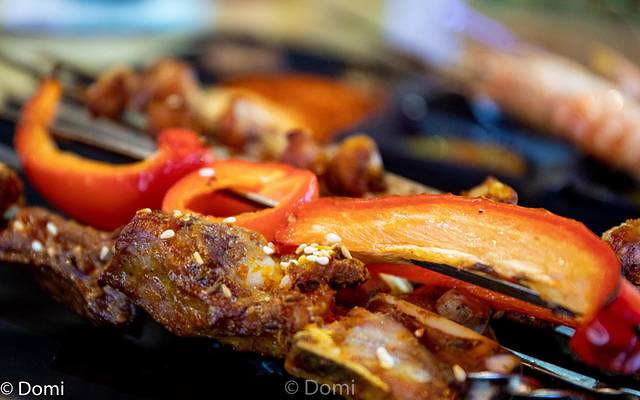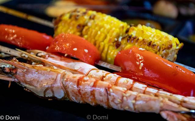 夜色朦胧、天空渐暗,锦里的繁华才刚刚启程,古色古香的建筑下应着人群向前也有一种悠闲自在,仿佛这里的一砖一瓦都能给身体传输轻松的信号。没打算在这里吃饭,不过一个个路过的小吃店总让人禁不住诱惑!