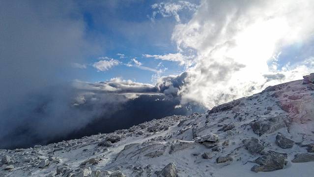 穿过大石板,我们来到了碎石坡,这里已经可以看见雪了。从大石板到碎石坡的这段路,我个人感觉是天亮前最为艰辛的一段,我看着月亮在繁星中渐渐消失,太阳从地平线升起,感觉走了几个世纪那么久。