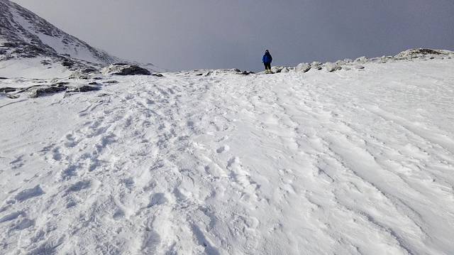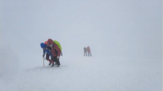 其实这张照片还没有到绝望坡,但再往上能见度极低,没有一张能看清全貌的照片素材,先用这张路况类似的照片替代。绝望坡比图中的雪更厚,坡更陡,每往上跨一步总能滑下来三分之二步,不太长的一段坡怎么也爬不完,这真的让我很绝望。