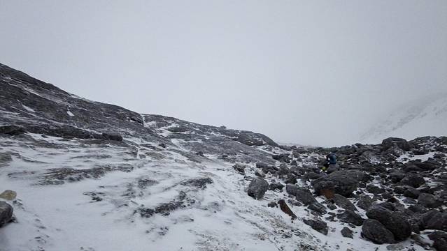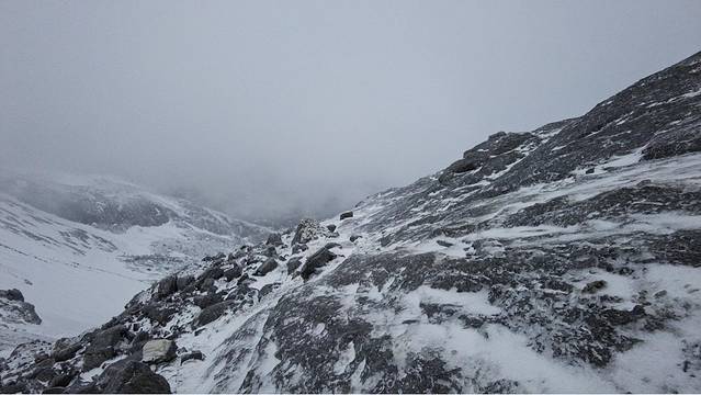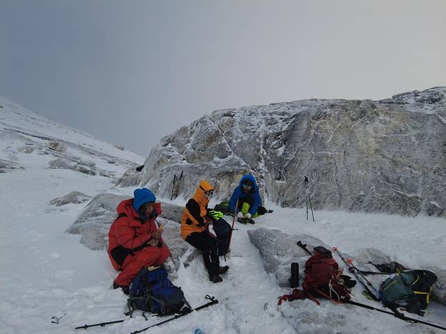 除了大风,天上还下着小冰雹,由于没有面罩,我大半张脸被冰碴子拍打一两个小时。尽管天公不作美,但身体还算给力,在碎石坡这段路,我把体能调整到了最佳状态,经过一段时间的适应后,大约凌晨五六点时,负重已经不是问题。随着爬升节奏的放缓,中途休息频率及时间也大大减少,一路赶超了不少之前把我甩下的山友。