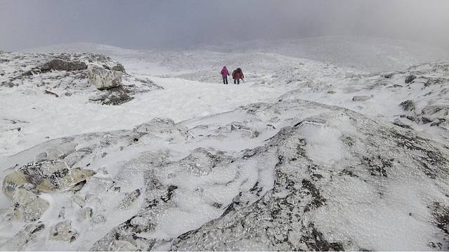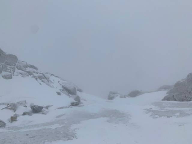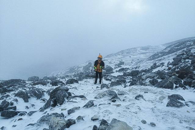 图中的这两个人我们在后面的路上也碰到了,穿紫红色冲锋衣的女生出现了失温现象,她的向导不仅没有第一时间带她下撤,反而停在路上给她搓手,实施了常见的错误救援方法。吉克看见后,立马上前提示了风险,并严肃的告诉他们,如果不想死在山上就应该迅速下撤。后来,我们目送他们离开了,这是今天看到的第二批还没到五千米就下撤的山友。