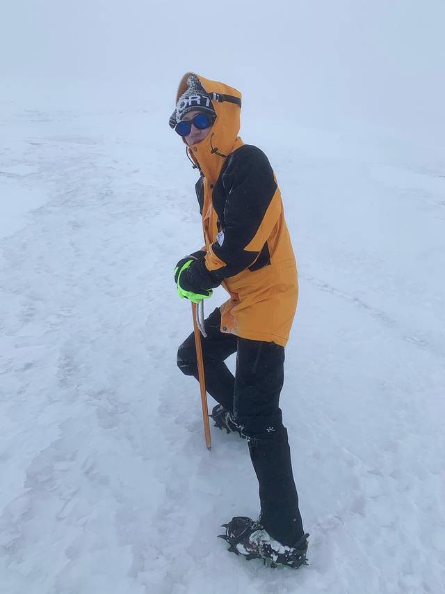 刚开始下山时,我们的速度快了许多,心想着如果上山也能这么快就好了。没想到走完一段坡还有一段坡,让我数次怀疑这不是来时的路,吉克肯定的说我们上来也走了这么远。下撤到一段陡坡时,我小心翼翼的慢慢往下挪,这时一阵大风刮来,我直接从雪山上滑坠了,大脑蒙蒙的完全忘记了要用冰镐制动,还好吉克在下方接住了我。寒冷、恐惧、体力不支的我难受极了,心想着五一去旅游不好吗,在家躺着不好吗,为什么要来这里受罪。