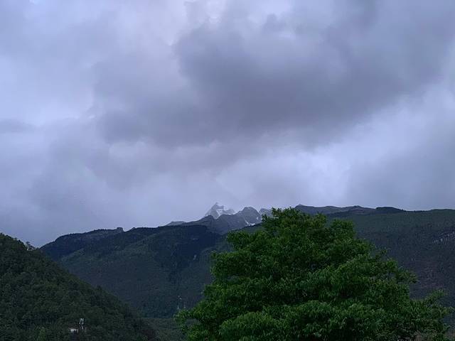 准备回房休息时,抬头看了看远处,那个白色的山尖就是我即将攀登的哈巴雪山。