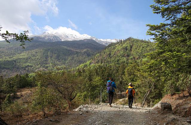 早上9时22分,海拔3150米,吉克根据我的身高和路况帮我调好了登山杖,我们从这里开始轻装向哈巴大本营徒步前进。