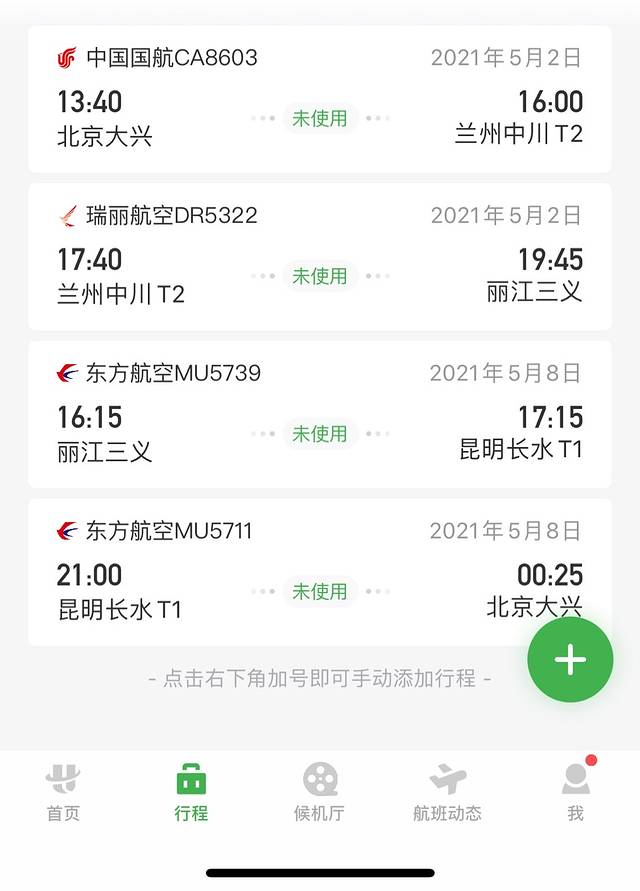 五一期间北京往返丽江的直飞机票需要四五千元,实在是太贵了,假期充裕且喜欢坐飞机的我选择了转机航班。经过“错峰出发+大兴机场起落+转机”这一系列降成本操作后,机票依然花了我两千五百块大洋。