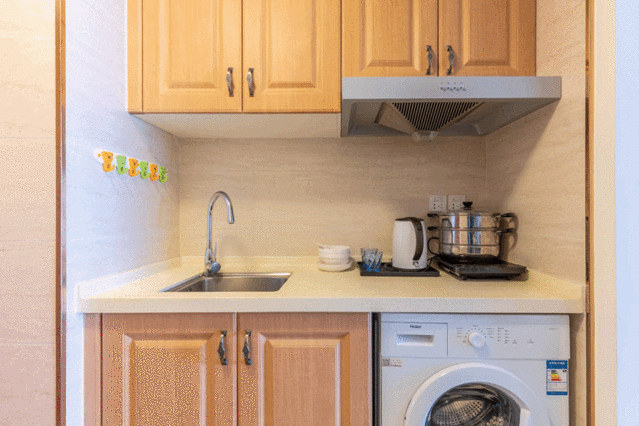 有洗衣机,水池,可以租用锅具。洗手间也是干湿分离的,很干净。