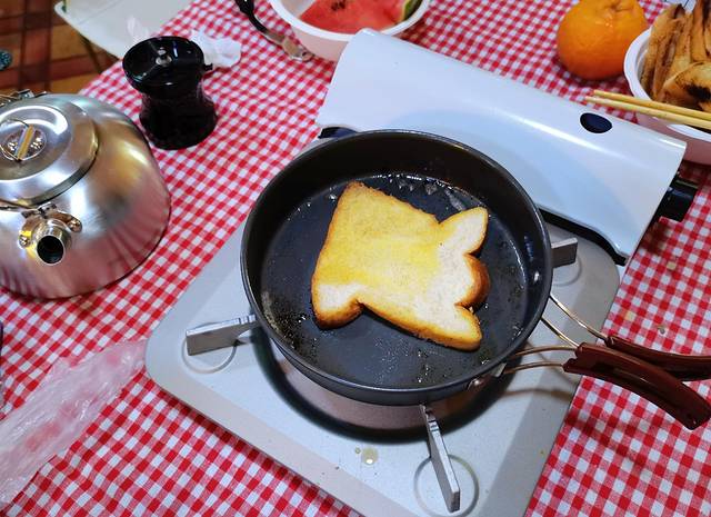 早起的小伙伴已经开始为大家煎面包了