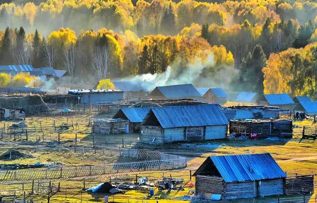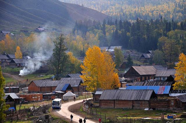 --禾木村位于北疆阿勒泰地区布尔津县,喀纳斯湖东侧约30公里处,是一个由哈萨克人和图瓦人共同聚居的小村庄。 --这里的房子全是原木搭成的,充满了原始的味道。 --禾木村最令人着迷的就是万山红遍的醉人秋色,炊烟在秋色中冉冉升起,形成一条梦幻般的烟雾带,胜似仙境。 --摄影爱好者会在清晨登上禾木村旁边山上的观景台拍摄禾木村的晨雾,大多数禾木的全景图均在此拍摄。