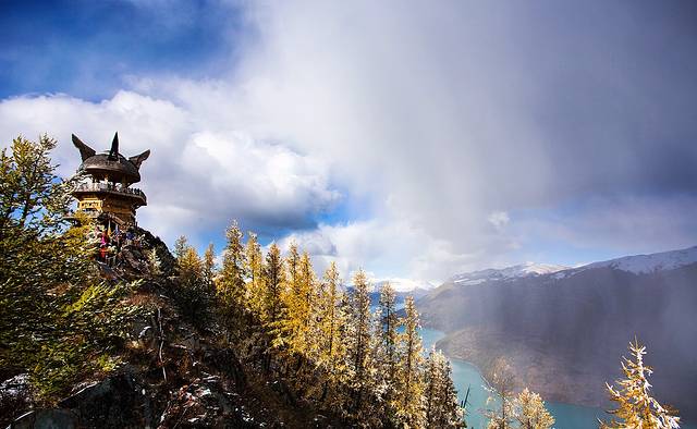 观鱼台位于喀纳斯湖西岸骆驼峰顶上,本为观“湖怪”而建,因此得名“观鱼台”。与湖面的600多米的高度差让这里成为俯瞰喀纳斯湖全景的最佳角度,不仅可将四分之三的湖面尽收眼底,还能观览湖周的层峦叠嶂、翠峰倒影。若举目北望,还能清楚地看到阿尔泰山的最高峰——友谊峰。所以,登观鱼台就成了来喀纳斯游玩的必做之事。 上观鱼台有两种方式可选。一是坐车,单程60元/人;若坐车上山,走下来便可以省60元。对于体力好的,推荐沿那条湖出水口山前专为爬山者铺设的石阶步行而上,一共1068个台阶,约1.5个小时。