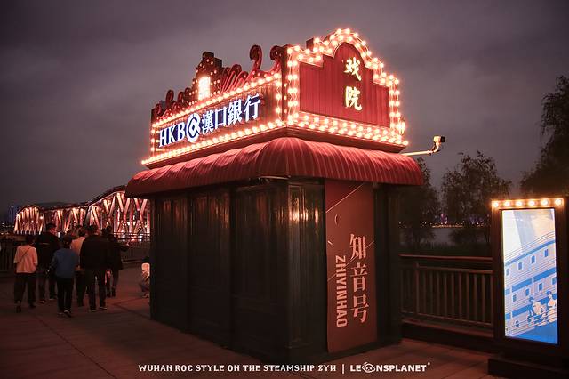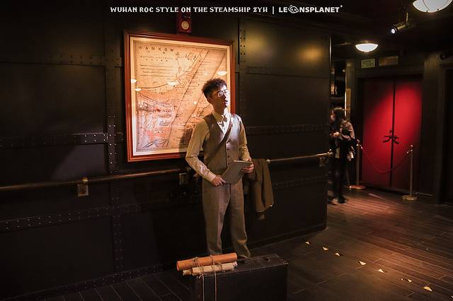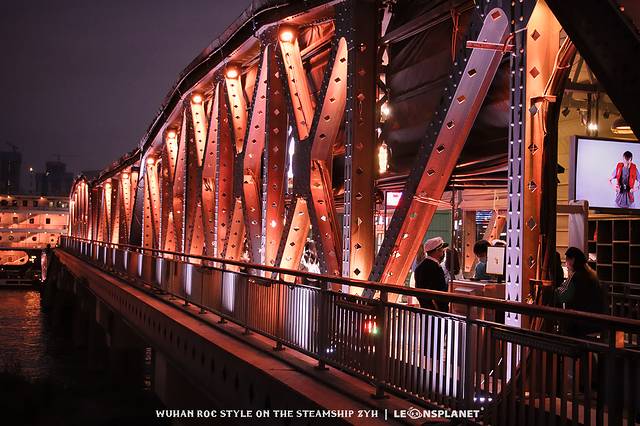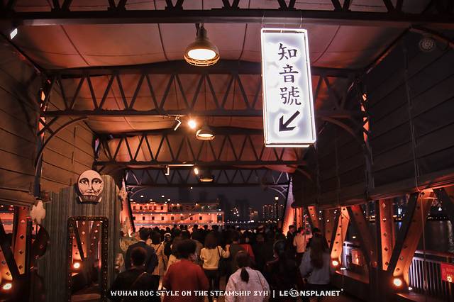 跟随这拨兴致勃勃的观众往前走,来到通往趸船的钢结构廊桥,颇有上海外白渡桥的神韵,而桥上更是被装点的满眼民国风情:
