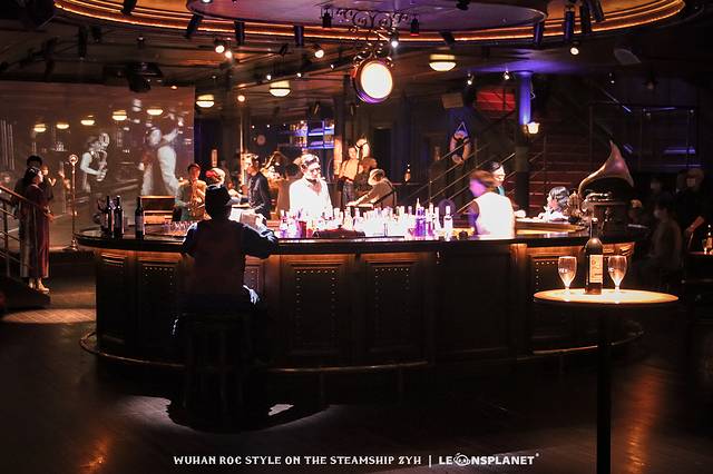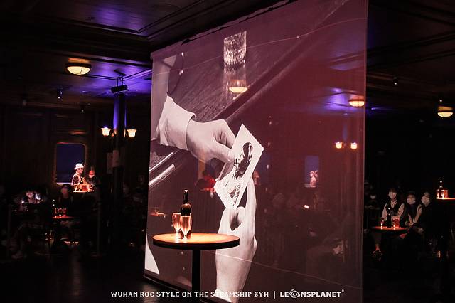 与舞厅结构类似,酒吧的表演以圆形吧台和投影幕墙为中心,四周设有船客席,席台上摆着红酒瓶和高脚杯,配合幽暗的背景和单独打亮席台的光源,超适合凹造型出文艺片。
