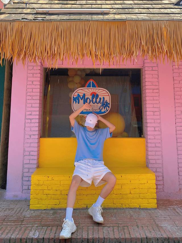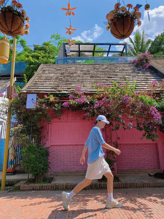 粉红色的房子配上三角梅,门口撞色的黄色座位都非常出片。白天来这里拍照,张张都是绝绝子啊。