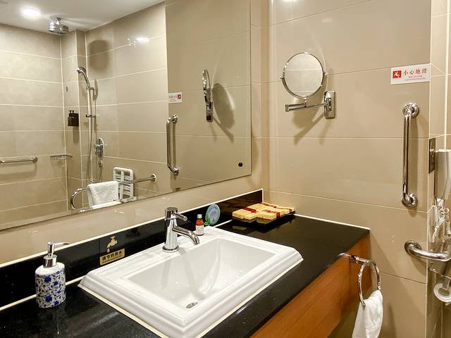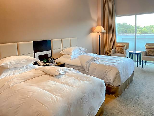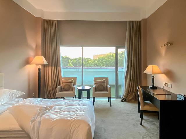 宾馆占地总面积480亩,建筑面积近5万平方米,总投资4.1亿元。因为依山而建,所以酒店大堂在5楼,很多客房位于4楼以至更低楼层,紧邻湖泊水面,是一个不折不扣的性价比很高的宝藏酒店。它集住宿、餐饮、会议、娱乐、商务、购物、健身为一体,内部装修豪华而不失典雅。热门房型是商务大床房或者标间,推门就是湖景,而且位于四楼、三楼的客房,躺在床上即是树木葱茏的景色。部分房间还有露天大阳台,采光度非常好。房内设施齐全,最贴心的就是开夜床,酒店为宾客提供的具有瓷都特色的生肖陶瓷纪念品。一连住了4晚,每晚生肖都不一样哟!非常具有纪念意义,很独特的伴手礼。当然此外,还有帮助睡眠的“酸奶”。