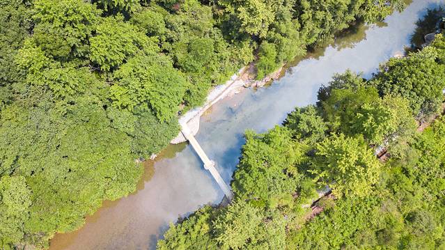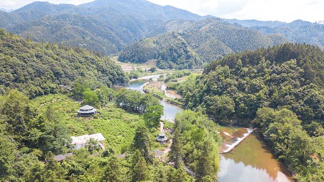 航拍视野下,村子依山而建,顺势蜿蜒,从入口到最深处,呈狭长型,徒步单程约20分钟。三宝国际陶艺村总共占地面积13余亩,由创作空间,生活空间和展览空间三个部分组成。所以最佳体验方式,可以步行往返。
