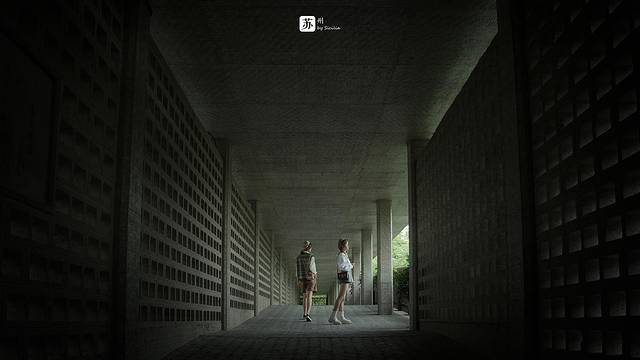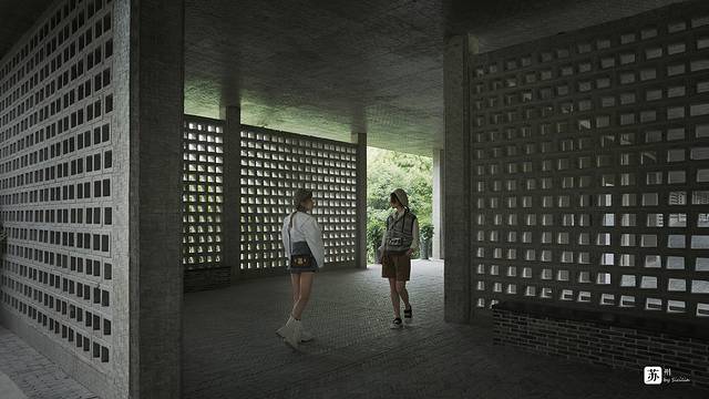 博物馆前的砖廊做的非常干净,外观承袭苏式的园林长廊,但风格和材质却又略不同于苏州园林的精致温婉,显得十分粗犷大气。