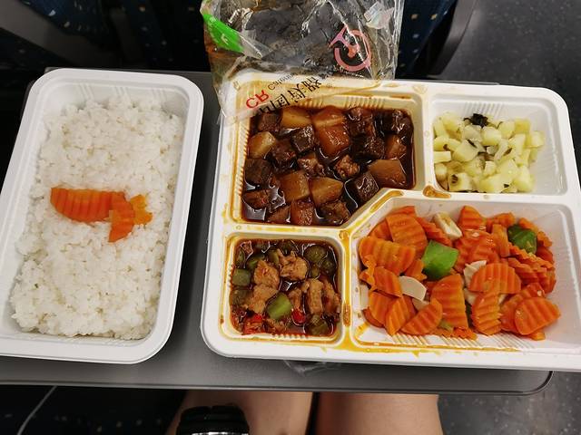 这趟高铁不能点外卖,只好吃高铁盒饭。
