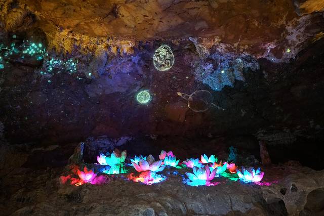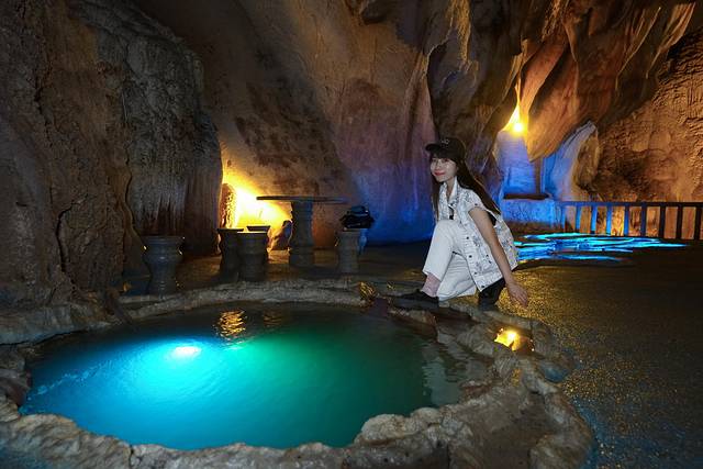 这个溶洞分为两部分,先去秘境观赏,里面有一些灯光并融合了民族文化,场景很梦幻,溶洞秘境总长度约为1600米,分为四个主题19个主景;另一部分是更原始的溶洞探险,需要佩戴探照灯深入溶洞。