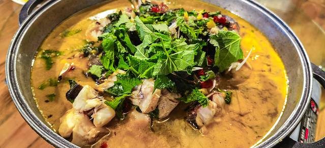 不过樵语湖山最绝的不仅仅只有湖山辣,这里的农家菜才是我们的心水。湖山的主打美食必定是碧水料理湖山鱼头锅了,肉质鲜嫩的鱼被樵语湖山农庄烹饪成味道不同、做法不同、配料不同的各种农家鱼,还有俗称“巴掌鱼”的湖山特色小鱼,加入黄瓜,清新爽口又不失小鱼本来的鲜美,即便是乱炖也能成美味。这里还有一个特色,就是用祛湿茶煮蛋,再配合猪脚,炖成一锅,美味又有营养,祛湿又美容养颜。
