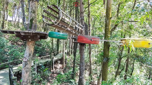 丛林穿越是一项在树上进行的森林公园项目,是集冒险、运动、娱乐、挑战于一体的户外运动项目。整个丛林穿越,是将各种各样的障碍环节将树连成一条线路,汇集了高空、速度、力量、毅力等户外探险所必备的元素,为参与者提供了感官上的刺激。不要担心,还是很安全的,体验的话会有非常牢靠的安全措施,绝对不会出安全问题的,虽然这里古木参天,但丛林穿越可以不对树木进行砍伐,不破坏生态的同时也不影响树木的正常生长,不破坏环境。