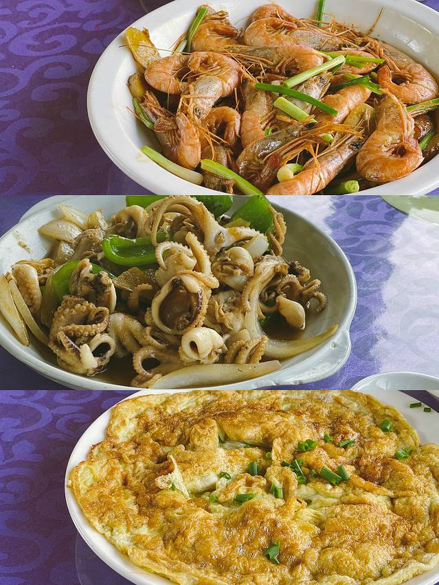 随便找了一家可以看海又有空调的餐厅,叫“海韵餐厅”,点了红虾、鱿鱼和银鱼煎蛋三个海鲜菜,相当新鲜,味道也很不错。