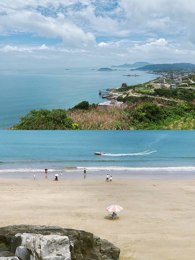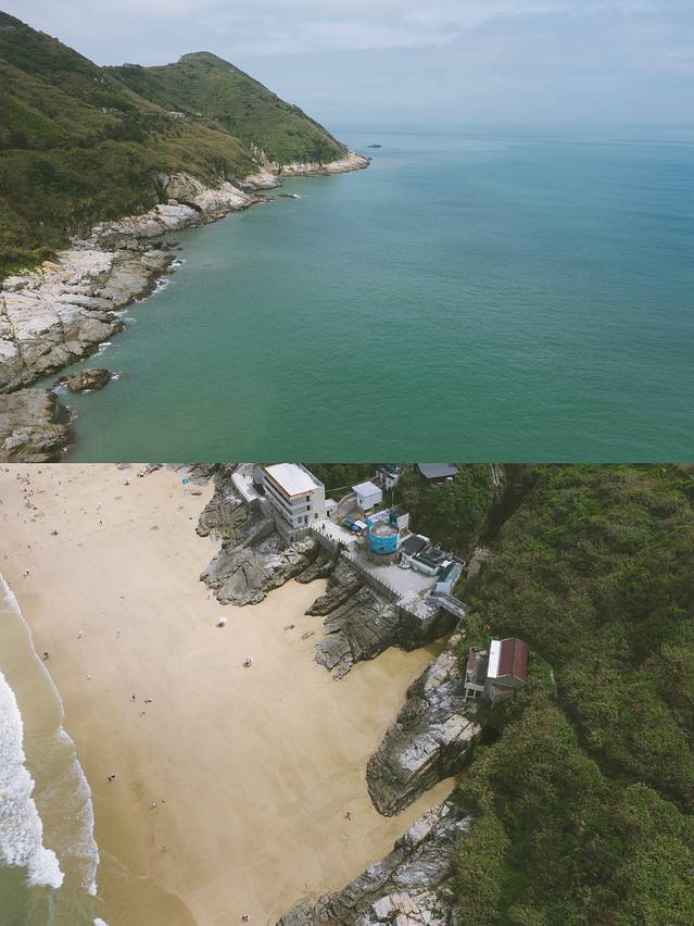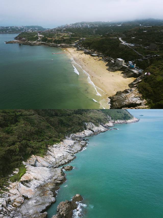 洞下沙滩算得上台州最大的海滩了,需要开一段盘山公路翻越一座山,停完车沿着台阶一路向下才能抵达,沿路俯瞰洞下沙滩非常美,海水颜色虽不及 海南 ,但也微微泛着蓝光。