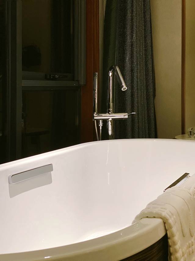 最便宜的房型只要500-600+,但是房间面积比较小,我们想住的宽敞一些,定了一个40平的套房,有一个大大的阳台,床边还有大浴缸,还贴心的配备了一次性泡澡袋。