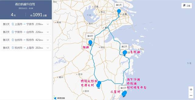 总行程为4天,考虑到上海开到温岭要将近6个小时,自驾时间太长,端午小长假前一天晚上下了班就直接出发了,先开到宁波住了一晚,第二天从宁波开往温岭 会轻松很多。