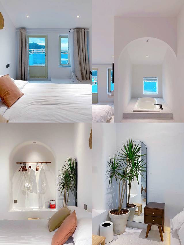 房间内都是纯白色的简约风,形状有一点类似于洞穴,我定的是唯一一间在最高处四层的房间,也是最贵的房型,拥有一个独立的私人大露台,视野无敌,门外另一边也有一个大露台,虽然是公共区域,但也不会有其他人上来。想等于包场。