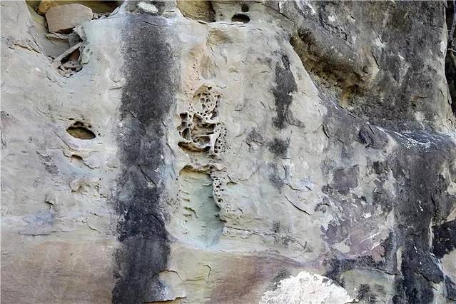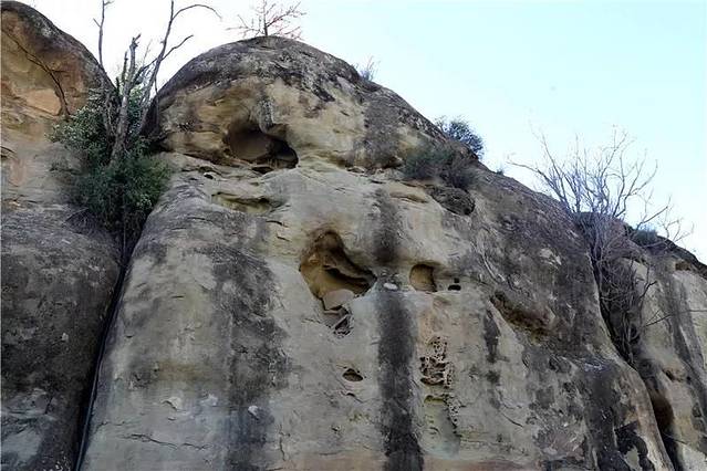 伏智寺石窟就凿砌在半山腰之上,该山形像一只威猛的卧虎,“虎头峁”大概也因此得名吧!山上多是被风雨侵蚀、鸟雀筑巢留下形状各异的孔洞,猛地看上去像是艺术家精心构建的雕梁画栋。
