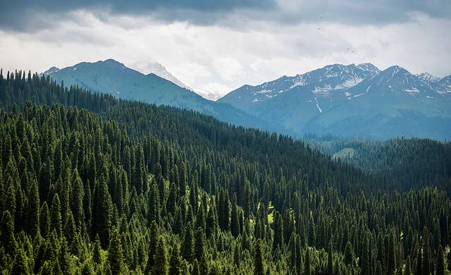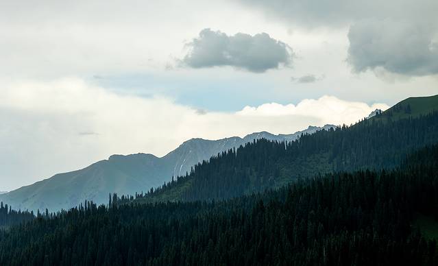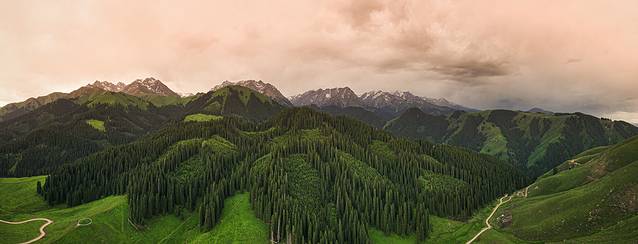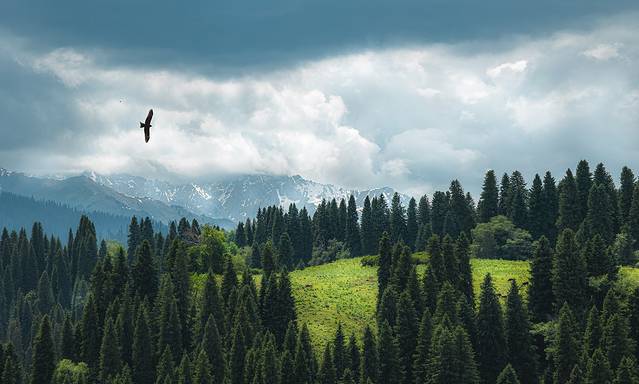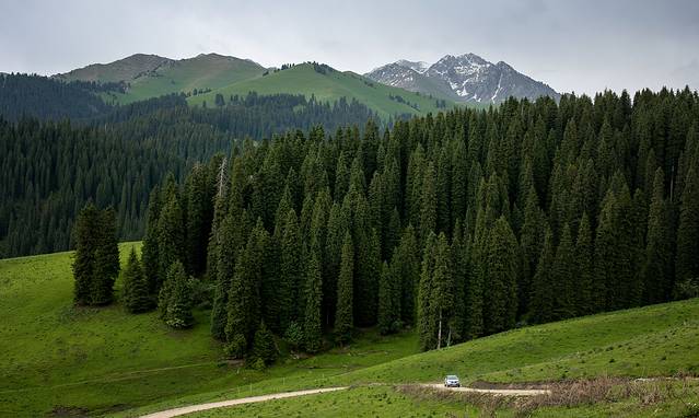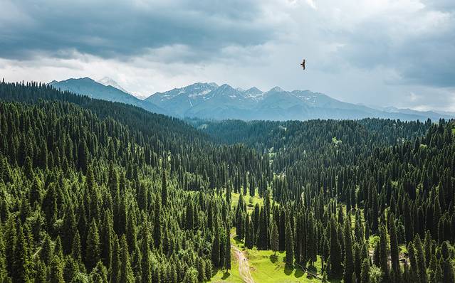 库尔 德宁风景区是天山山脉森林最茂密的部分,成群结队的云杉森林更是壮观,在航拍角度下,有一种军队出征的气势,云杉挺拔、天山险峻,叹为观止,山峰上未化的积雪更显得这里神秘莫测。