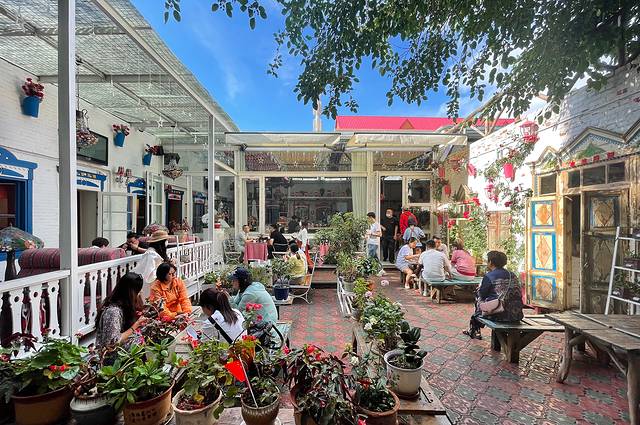 古兰丹姆是 伊宁 市网红冰淇淋店,花园一样的环境,让人看一眼就觉得美好,院子里放满了盆景绿植,人们随意地围坐着,这里不是一家店,而是一个朋友的聚会。