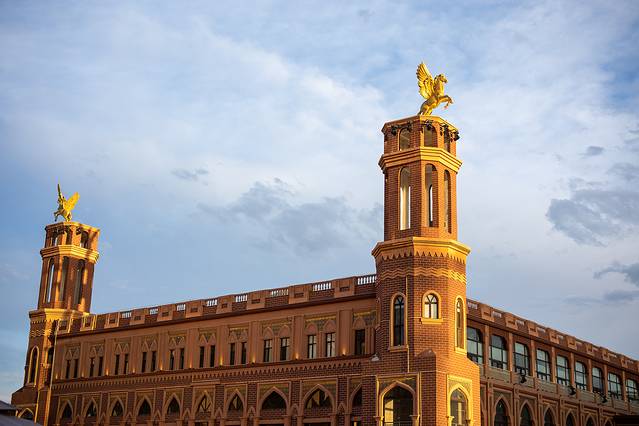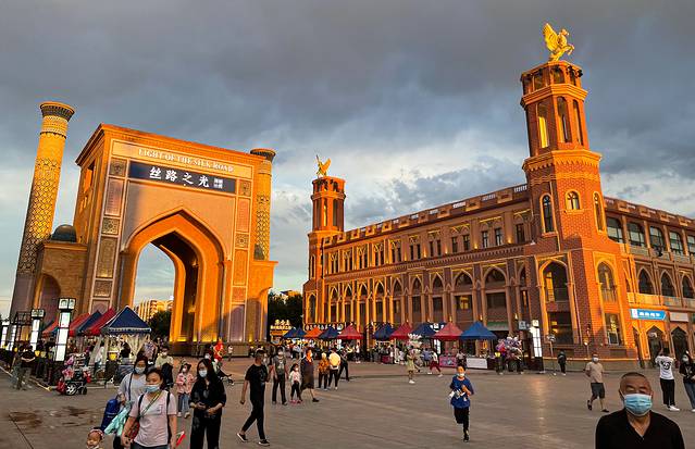 新疆 的夜来得都很晚,在晚上10点左右的时候天还是亮堂的,一行人来到了著名的旅游小镇 伊宁 丝路之光,感受当地人的日常乐趣。