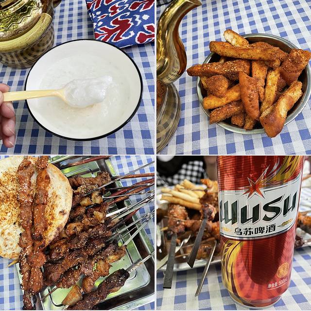 新疆 的羊肉串是非常出名的,在 伊宁 随便找的一家羊肉串店,喷香喷香的肉串和馕一起吃,滋味十足,羊包肝外焦里嫩,酸奶口味纯正,很适合跟肉食一起吃。不能少的还有传说中的 乌苏 啤酒,口感确实不一般,被不小心放倒的啤酒罐被友人调侃成“弄死你们”,确实配得上夺命大 乌苏 的称号。