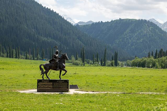 当你看到这尊雕像时就说明到了 库尔 德宁的核心地点,这位将军为了保卫家园而英勇战斗,人们为了表示尊敬,便用他的名字命名了这里最高的山峰“喀班巴依峰”。